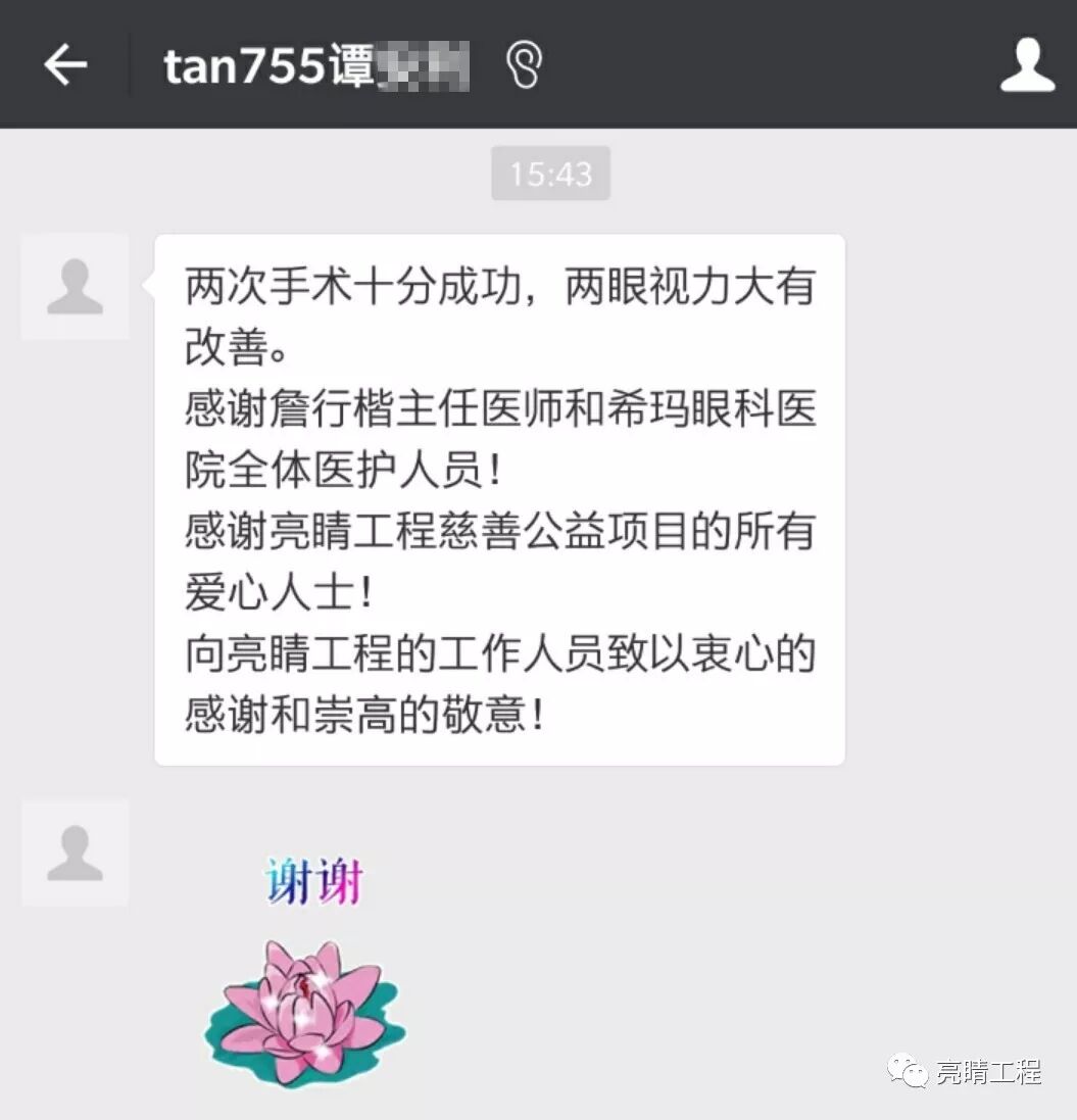 2017年11月27日,谭叔在深圳希玛林顺潮眼科医院顺利完成左眼的手术,为他实施手术的是希玛眼科医院医务总监詹行楷主任。2018年1月7日,詹行楷主任又为谭叔的右眼施行了手术。